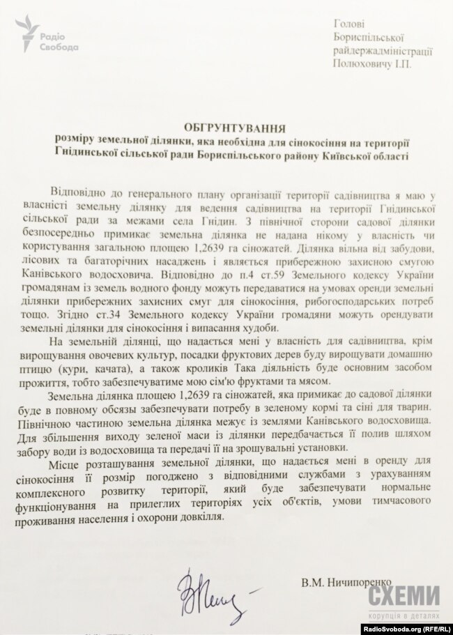 При цьому депутат Валентин Ничипоренко у заяві, в якій просить розширити ділянку, написав: «Надана мені ділянка використовуються виключно за цільовим призначенням. А саме сінокосіння трав для заготівлі сіна. Я звертаюся до вас з проханням розширити дану земельну ділянку, оскільки кількість заготовлених кормів є недостатньою для коней, яких я утримую. На земельній ділянці, що надається мені у власність для садівництва, крім вирощування садових культур, фруктових дерев, буду вирощувати птицю (кури, качата), також кроликів. Дана діяльність буде основним засобом прожиття, тобто забезпечуватиме сім’ю фруктами та м’ясом».