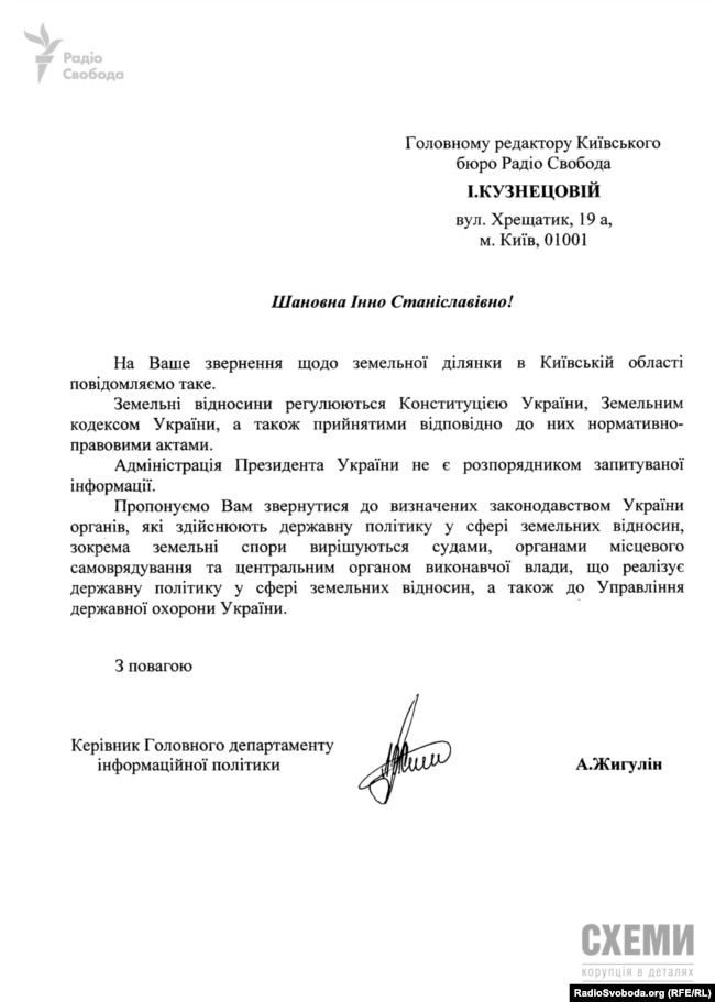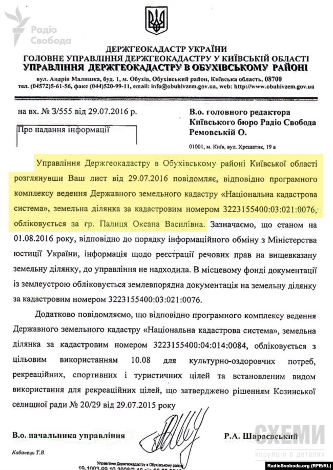Але за збігом обставин після того, як журналісти програми надіслали листа до Адміністрацію президента, ці документи з’явилися в Держгеокадастрі Обухівського району.
