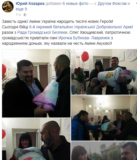 “Вместо одной Амины Украина родит тысячи новых Героев. Сегодня бойцы 8-го отдельного батальона Украинской Добровольческой Армии вместе с Советом Общественной Безопасности, Олегом Хвощевским и патриотической общественностью поздравили госпожу Ирочку Бубнову- Лавренюк с рождением дочери, которую назвали в честь Амины Окуевой!” – написал он.